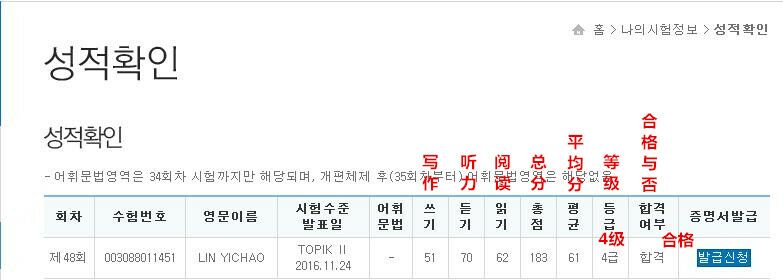 在10月16日举行的第48届韩国语能力考试(以下简称TOPIK)中,外语外贸学院14级应用韩语专业的13名学生中,有8人通过中级,其中四级4人,三级4人,中级通过率超过60%,其中林伊超和关咏诗两位同学的分数分别为183和181,接近5级水平(190即为5级),目前林伊超同学已被韩国釜山外国语大学国语国文专业入取,预计明年3月赴韩留学。