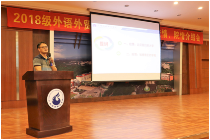 在这个五谷丰登,硕果累累的季节, 9月20日晚,外语外贸学院在人文艺术楼四楼报告厅隆重召开2018级新生见面会暨校情、院情介绍会。出席本次大会的有副校长李志强(兼外语外贸学院院长)、副院长刘榕敏、周银新、李霜和办公室主任高翔、各教研室主任、班级导师、学工办辅导员以及全体2018级新生。