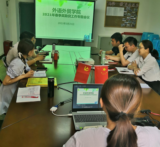 3月31日上午,外语外贸学院资助工作小组在人文艺术楼317召开了2021年上半年资助工作专题会议,学工副院长刘榕敏、学生工作办公室全体辅导员出席了本次会议,会议由刘星佐主持。