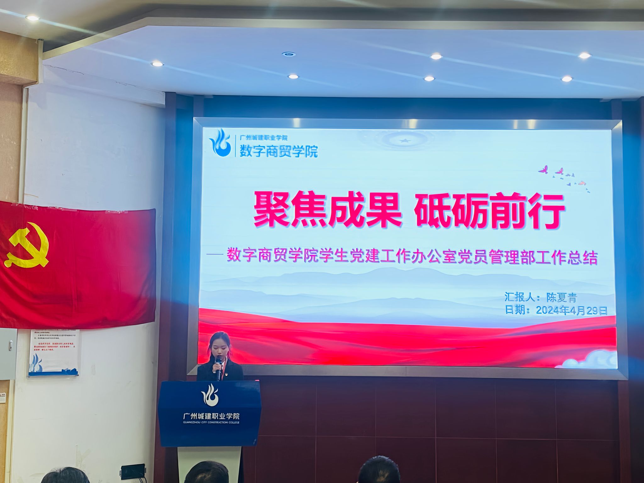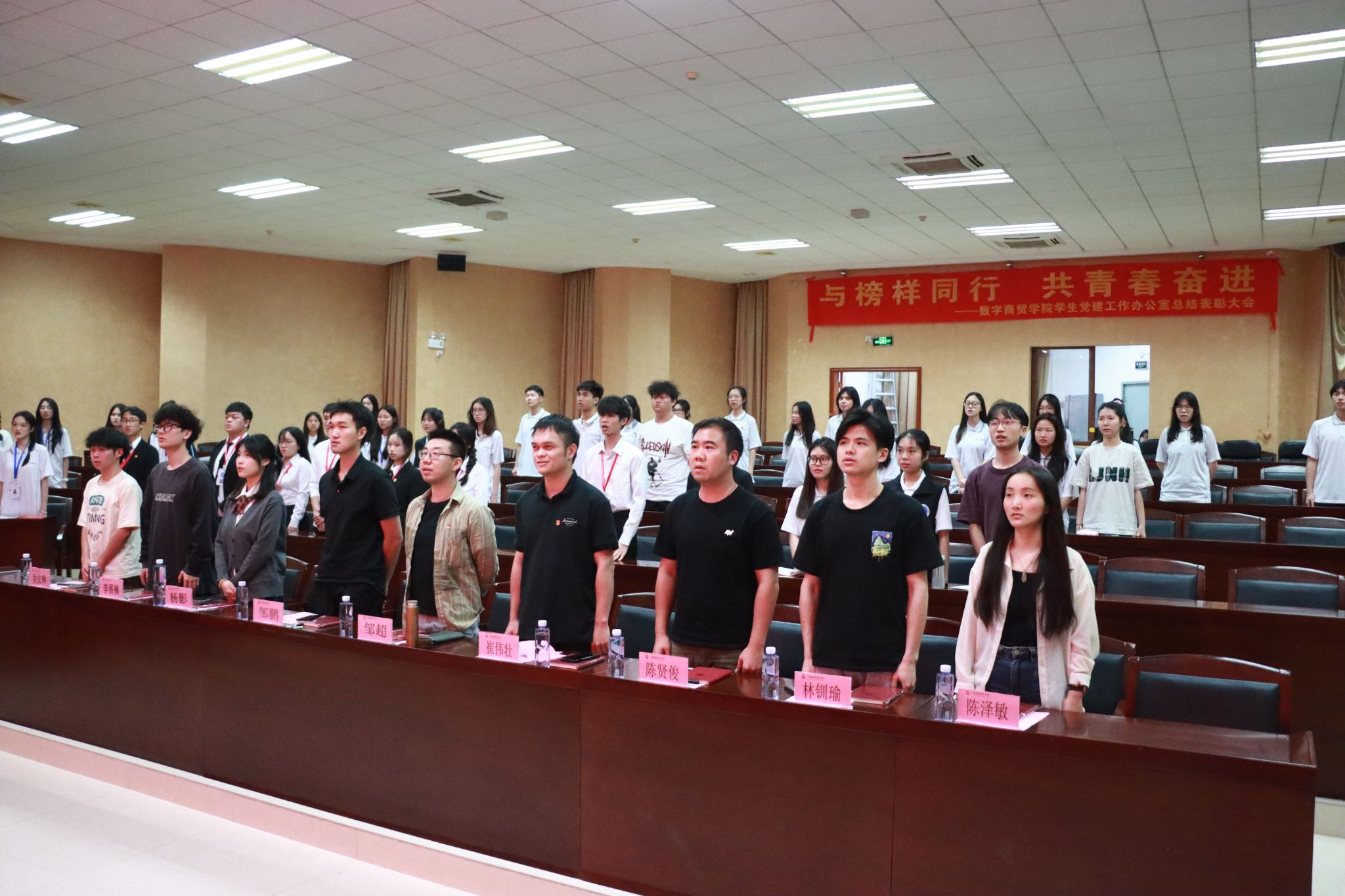 为深入学习贯彻党的二十大精神,树立典型,凝聚榜样力量,2024年4月29日,数字商贸学院学生党建工作办公室在建工机电楼A101报告厅召开了“与榜样同行,共青春奋进”总结表彰大会。学院党委副书记、副院长邹超,学生第一党支部书记邹鹏、党建办公室指导老师崔伟壮和全体辅导员出席参加大会,全体获奖人员、党建办公室全体学生干部、学生党员和入党积极分子共同参会。