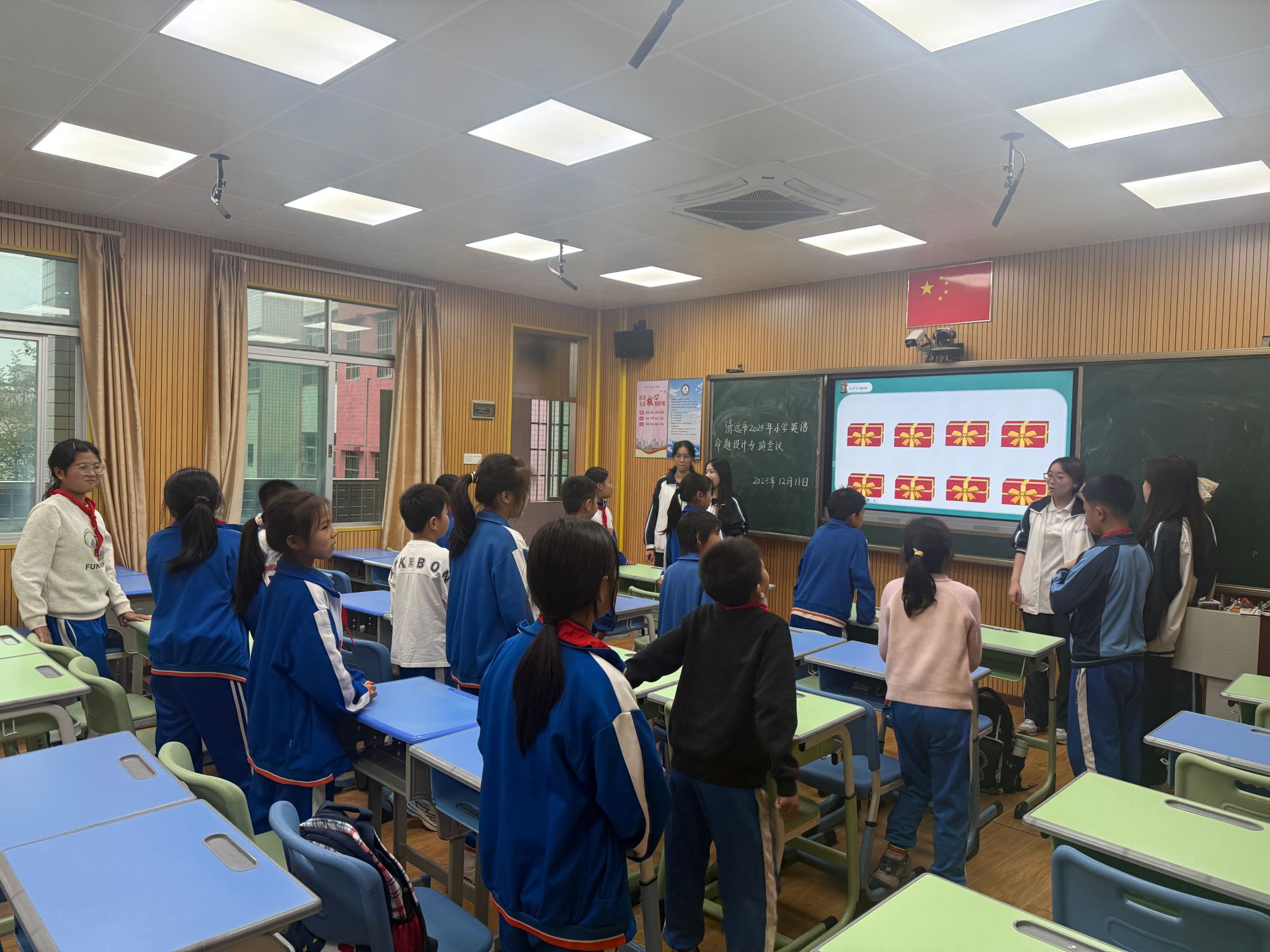 活动伊始,团队成员播放了兼具中外特色的节日乐曲,欢快的旋律瞬间点燃了孩子们的参与热情。将“Spring Festival”“Mid-Autumn Festival”“dragon boat”“moon cake”等中国传统节日核心词汇以及国外节日基础词汇与动态图片、趣味动画相结合,搭配地道的发音示范和形象的肢体动作,让抽象的单词变得直观易懂。同时,PPT页面上富有节日特色的动态画面,让孩子们目不转睛,跟读声此起彼伏,在视觉与听觉的双重刺激中轻松记住了各类节日相关词汇,同时对中西方节日词汇的差异形成清晰认知。