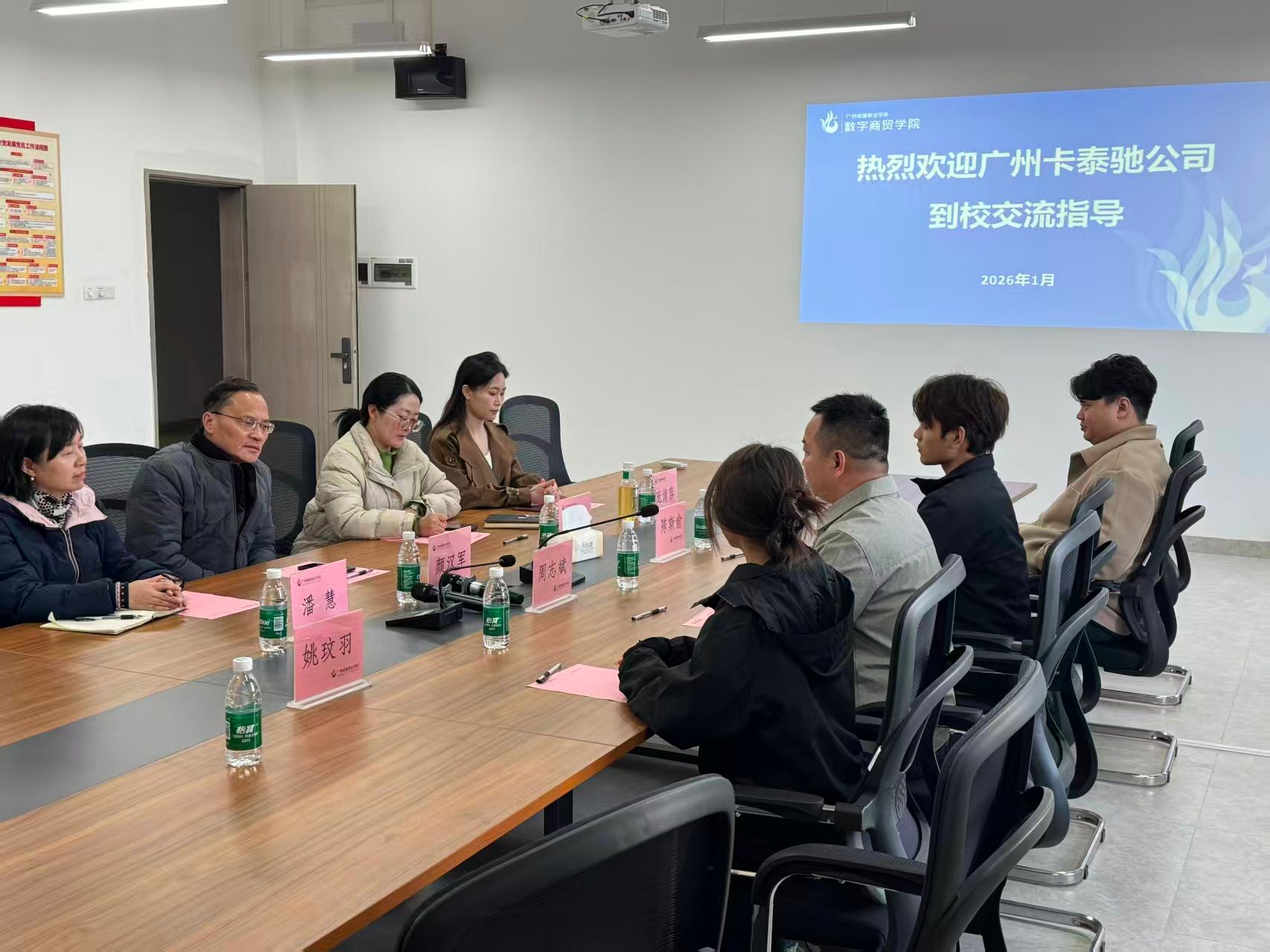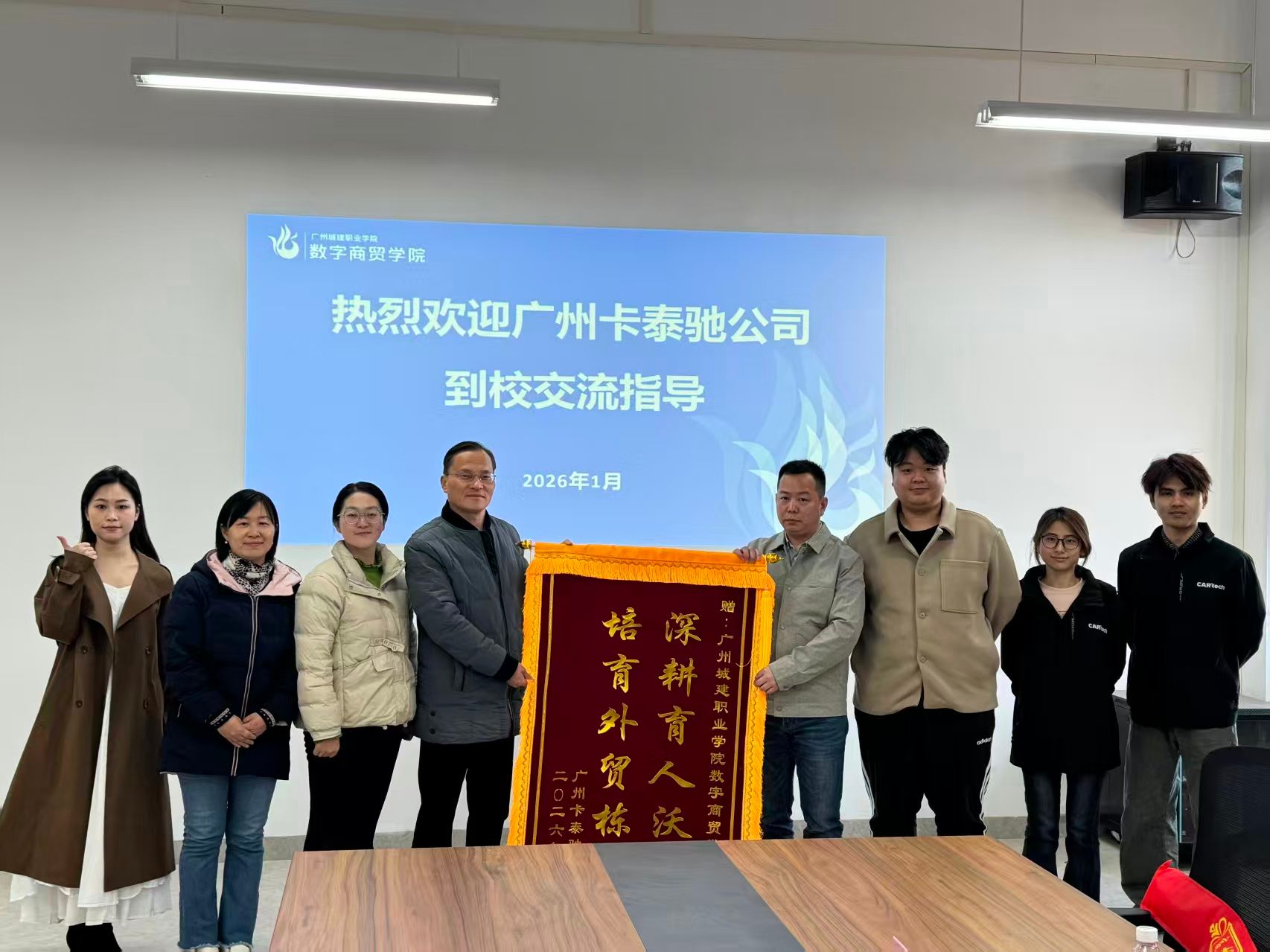 1月7日下午,我院学生岗位实习单位寰宇车盟(广州)汽车进出口有限公司卡泰驰业务部总经理周志斌一行到访数字商贸学院进行参观交流,并举行锦旗赠送仪式。学院对此次交流高度重视,颜汉军院长、袁其玲副院长、国贸与跨境教研室主任及相关教师出席了接待活动。