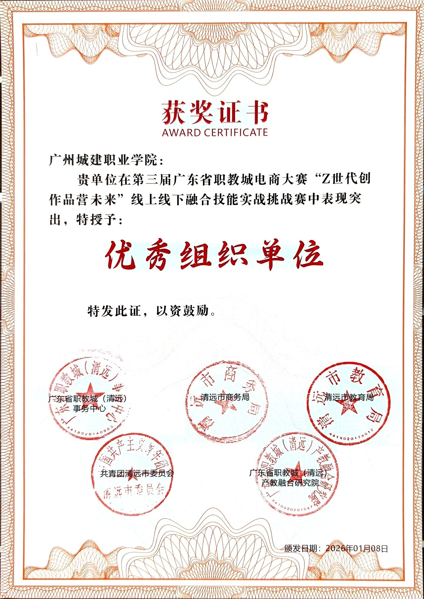 1月8日下午,第三届广东省职教城电商大赛暨“Z世代创营未来”线上线下融合技能实战大赛闭幕式在广东财贸职业学院清远校区圆满落幕。广州城建职业学院受邀出席本次闭幕式,数字商贸学院教师丘莉莎代表学校参与会议。凭借师生的优异表现与出色的组织协调能力,学校荣获“优秀组织奖”,丘莉莎、李宏烽、孙静三位教师同步获评“优秀指导老师”,彰显了学校在电商人才培养与产教融合领域的坚实实力。
