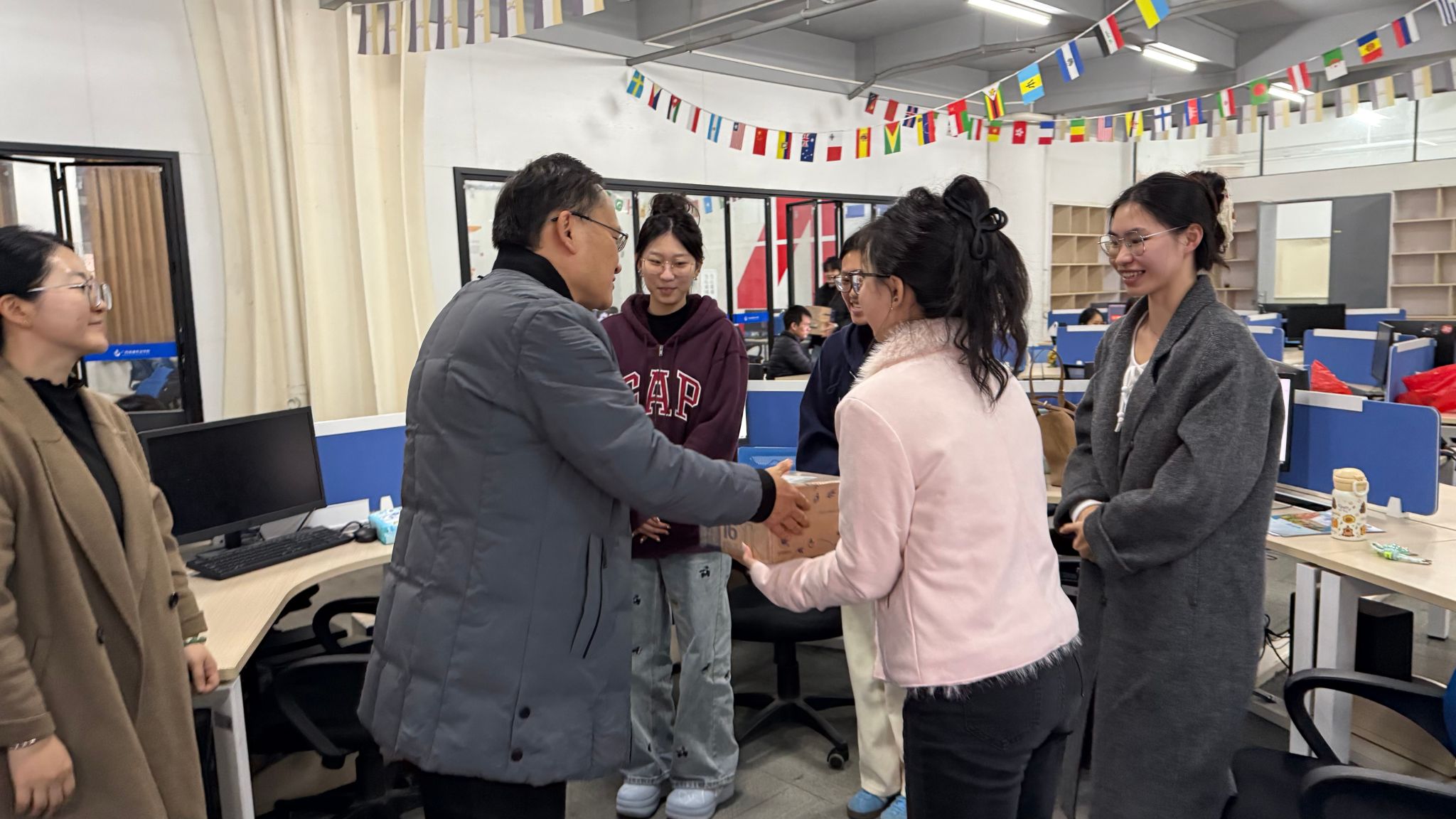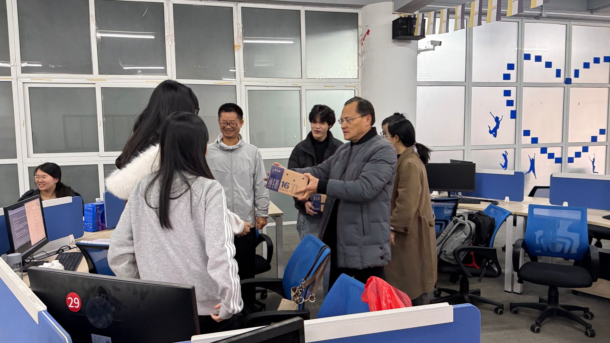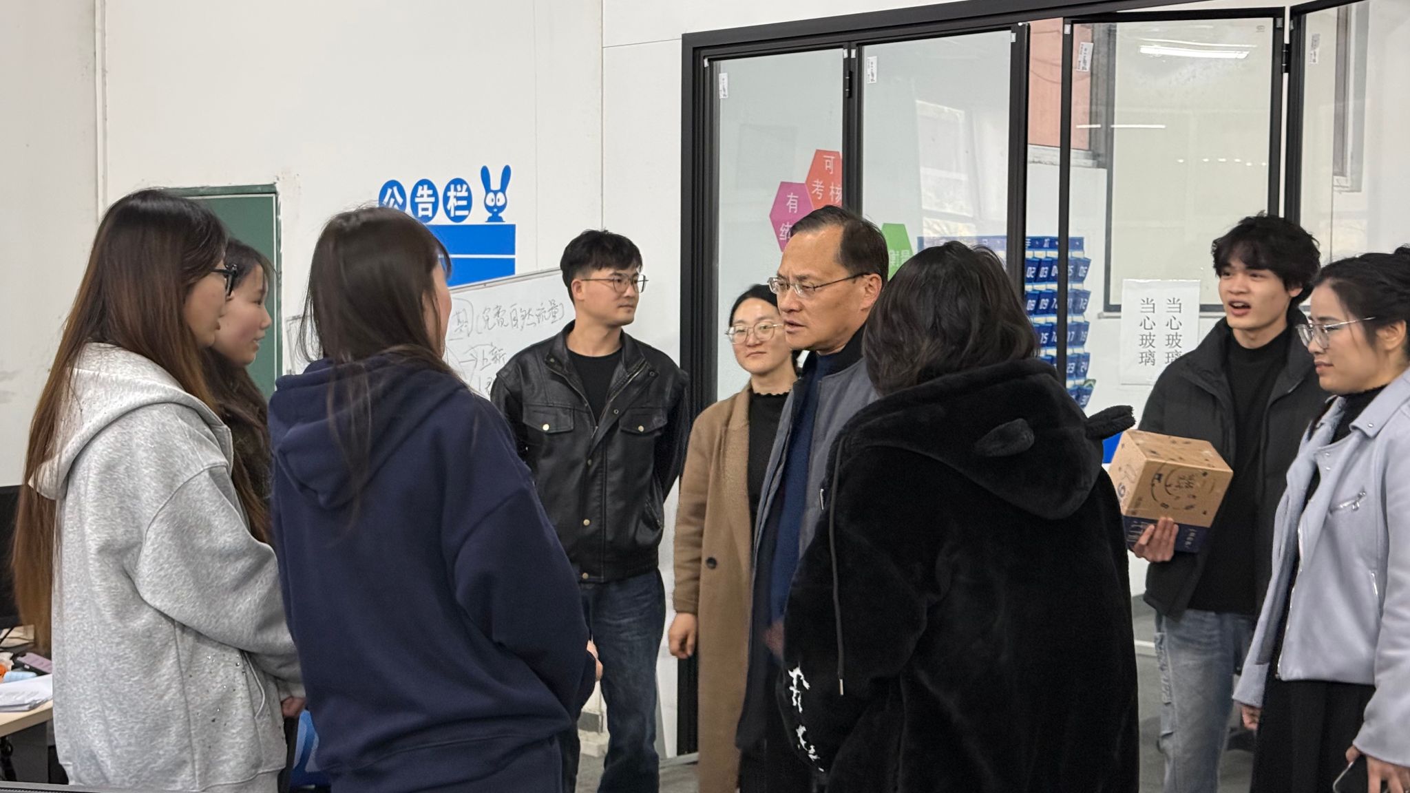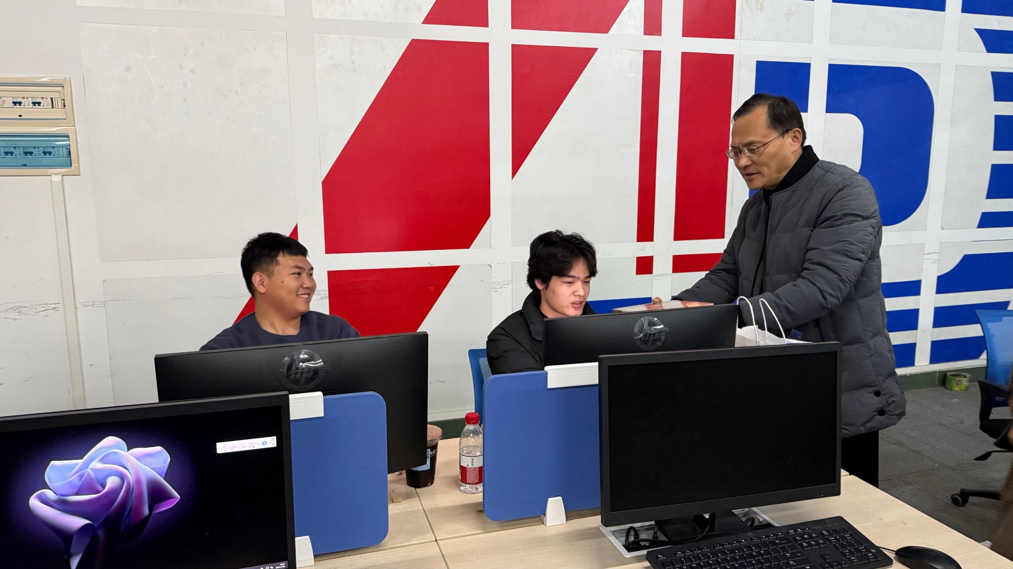 在集训现场,颜汉军院长代表学院为参赛学生送上牛奶等慰问品,并勉励大家:“寒冬砺剑正当时,希望同学们以赛促学、以赛强技,将集训中的汗水转化为赛场上的底气,为校争光、为青春添彩!”。叮嘱学生注意防寒保暖,学院将全力协调资源保障备赛需求。师生们深受鼓舞,现场响起热烈掌声。