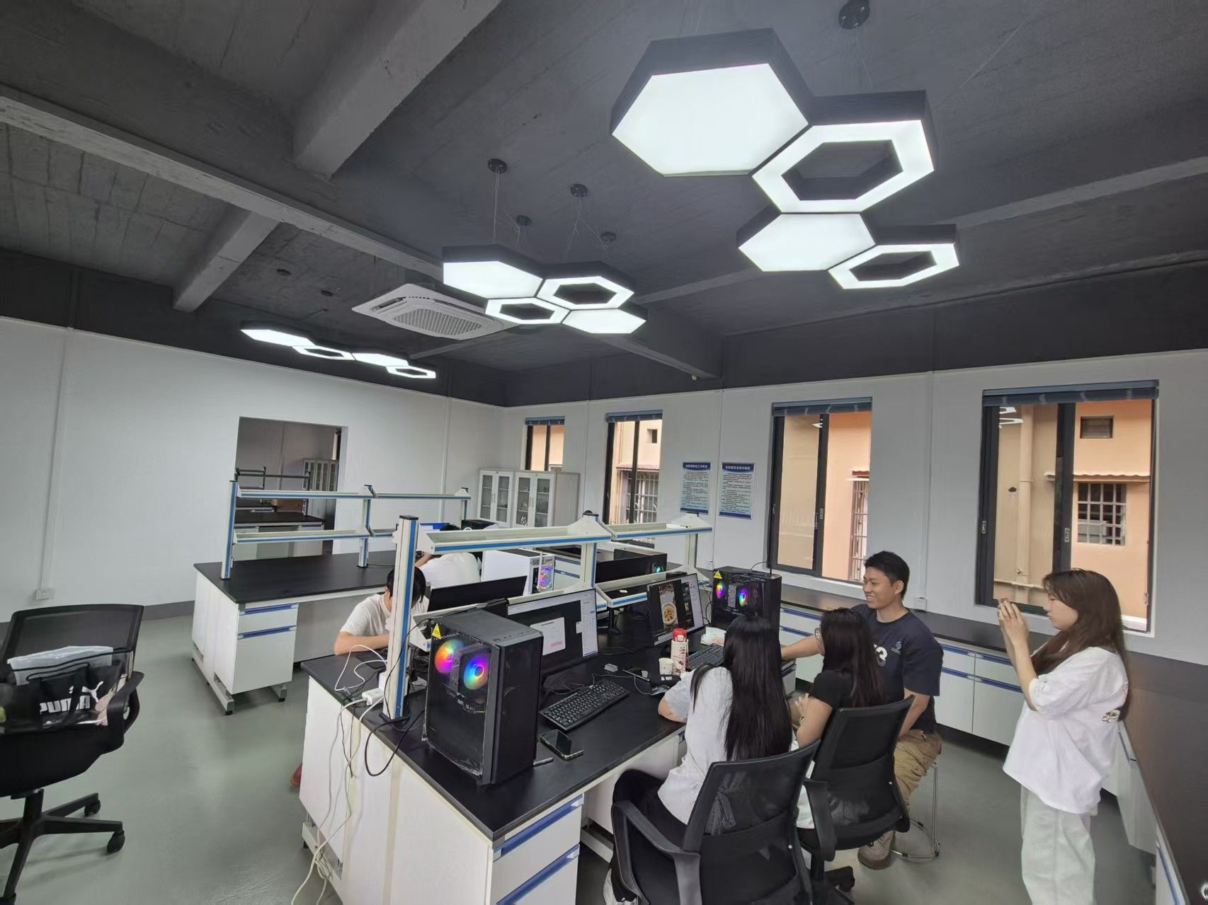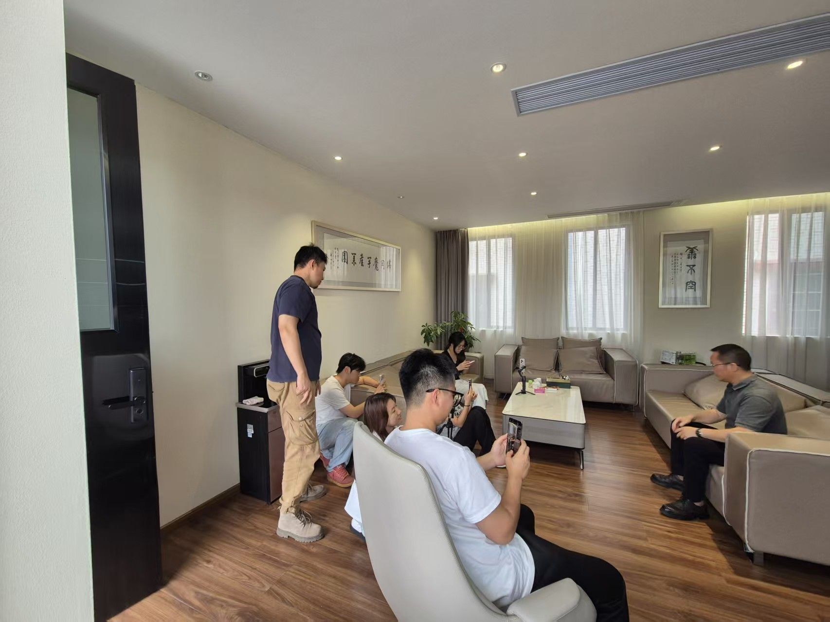 ▲师生在企业室内场景学习人物采访与镜头构图技巧