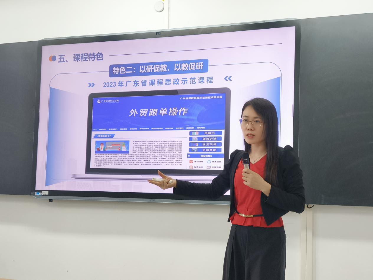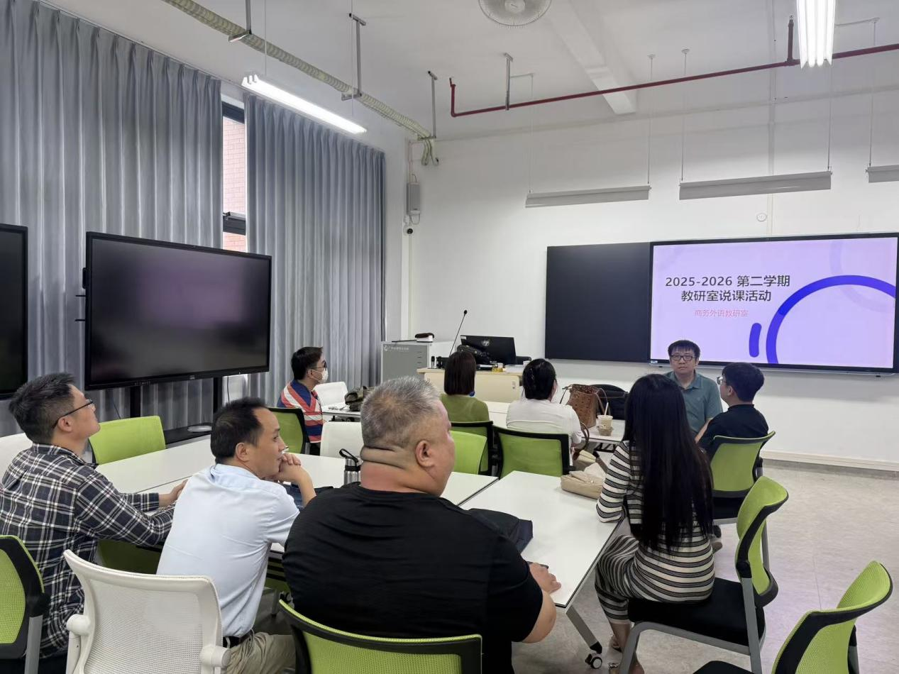 国贸与跨境电商、商外教研室分别在清远校区9号楼711课室、309课室举行线下说课。活动围绕课程定位、内容、资源、组织、特色、效果、教学技艺七个维度展开。教研室主任潘慧强调,课程是人才培养的核心载体。随后,校级说课比赛一等奖获得者钟飞燕、何慧及潘慧三位老师进行示范说课。钟飞燕以《外贸跟单操作》为例,展示基于典型工作任务重构教学内容并融入行业标准与大赛要求;何慧围绕《跨境电商沟通与客服》,提出AI融合课堂,利用AI工具与跨文化策略激发学生兴趣;潘慧以《跨境电商B2B运营实务》为范本,分享课程思政融入、工匠精神渗透及教学诊断改进闭环。