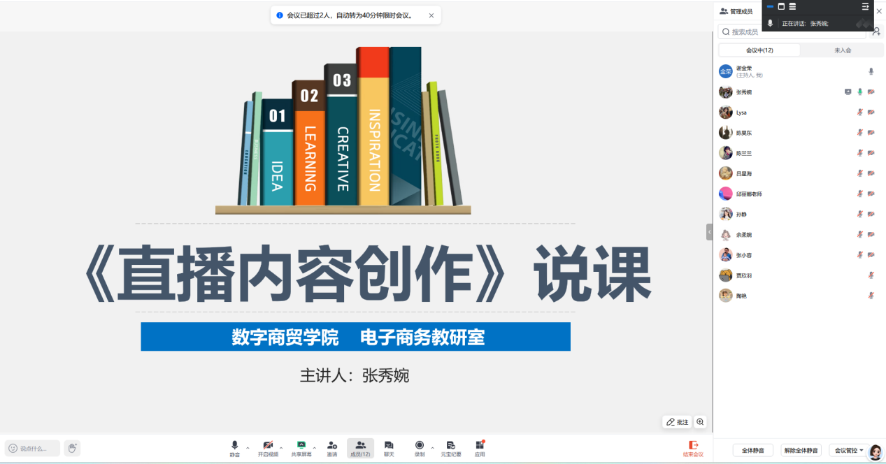 电子商务教研室通过腾讯会议开展线上说课。教师们围绕《网店运营实务》《新媒体运营实务》《电商直播实务》等课程,紧扣行业趋势与岗位要求,突出“岗课赛证”融合,强化实操与课程思政。交流环节中,大家深入探讨课程能力图谱、行动与学习领域重构,分享AI工具应用、企业项目引入及赛创融通经验,进一步统一教学标准、优化教学路径。