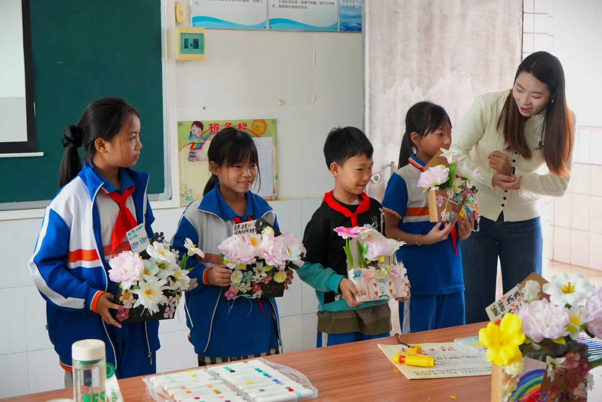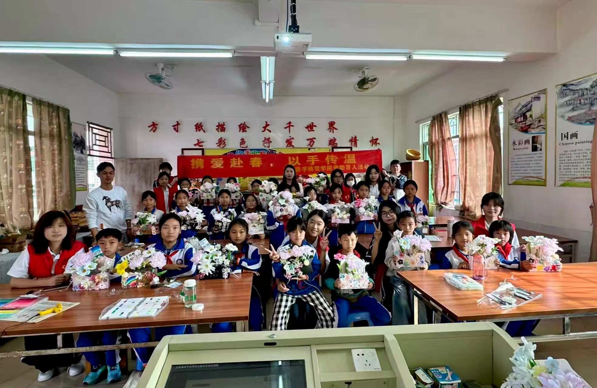 为深入贯彻习近平新时代中国特色社会主义思想,扎实落实立德树人根本任务,深化资助育人与感恩教育融合赋能。4 月 24 日,学院资助服务站组织受助学生志愿者,赴水头镇中心小学开展 “携爱赴春,以手传温”感恩花束手工义教活动。