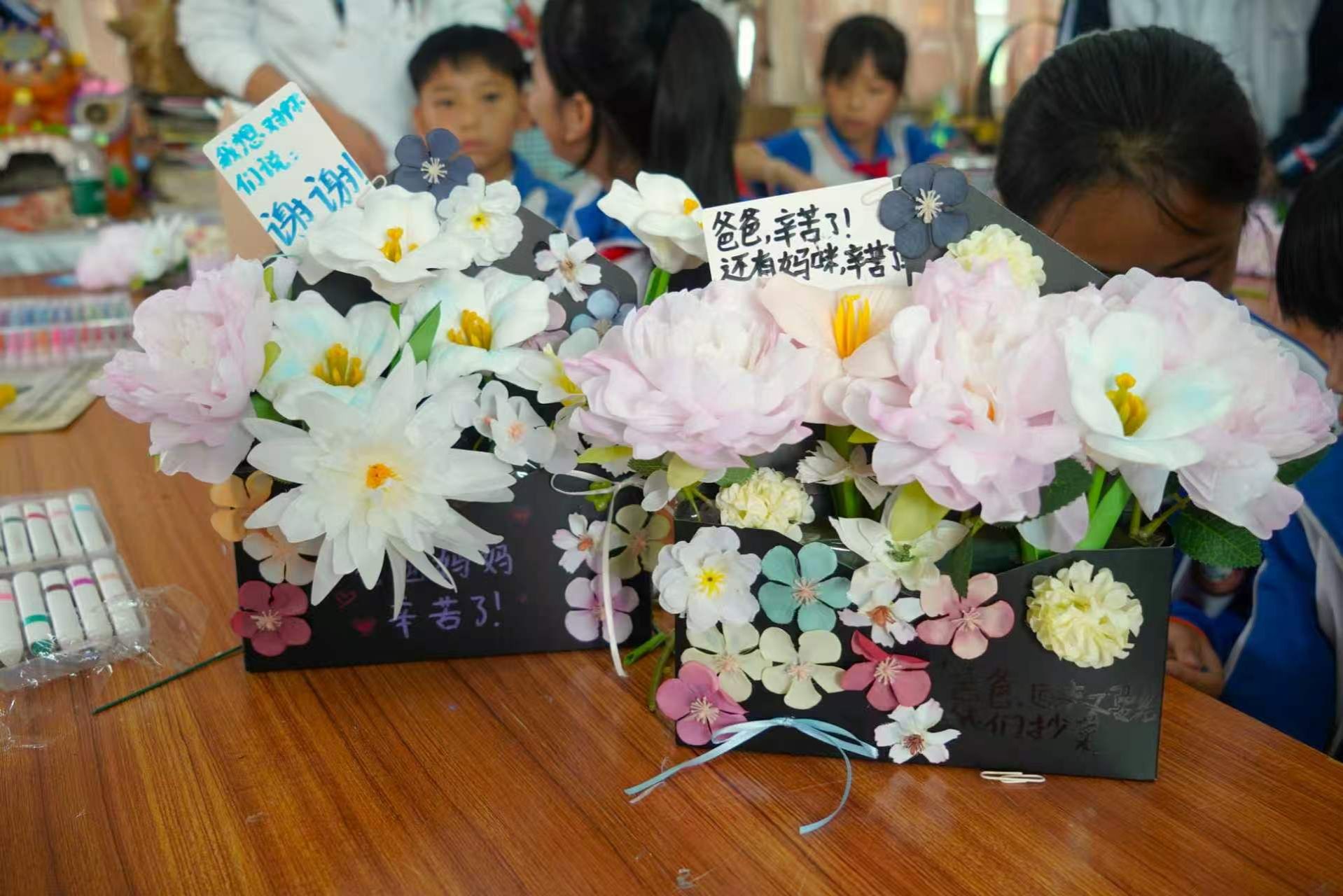 活动中,孩子们认真投入、积极动手,用彩笔描绘美好心愿,以鲜花寄托真挚情感,将对父母、老师与身边人的感谢,凝聚成一件件独一无二的信封花束作品。一件件充满童趣的手作,不仅展现了孩子们的想象力与创造力,更承载着最纯粹的感恩之心。现场暖意融融,欢声笑语不断,定格成温暖动人的瞬间。作品完成后,孩子们主动分享创作想法与感恩心愿,纷纷表示要将亲手制作的礼物送给最想感谢的人,用实际行动表达爱与谢意。此次义教活动,让小学生在实践中提升审美素养与动手能力,也让感恩教育从课堂走向生活、从理念化为行动。