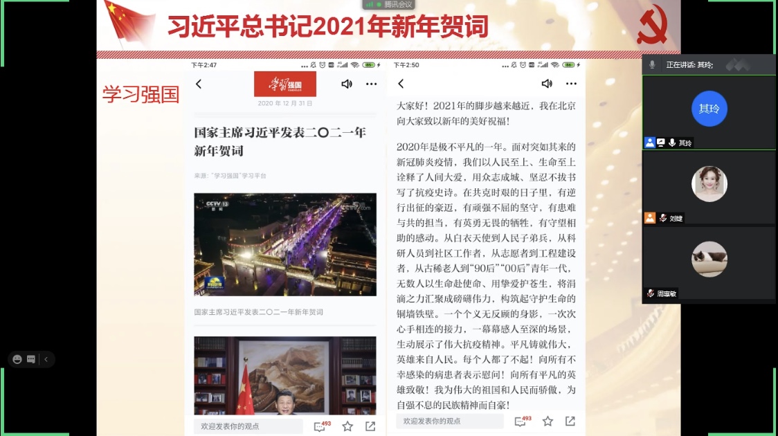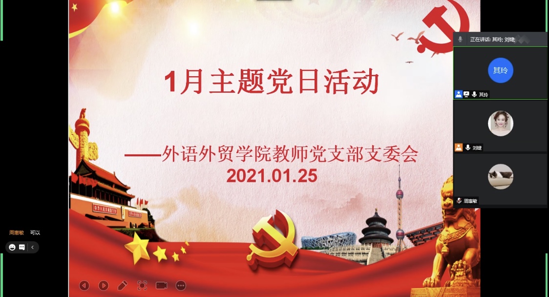 1月25日下午3点,外语外贸学院教师党支部支委在线上开展了2021年1月主题党日活动。活动由党支部书记袁其玲同志主持,支委委员参加了会议。