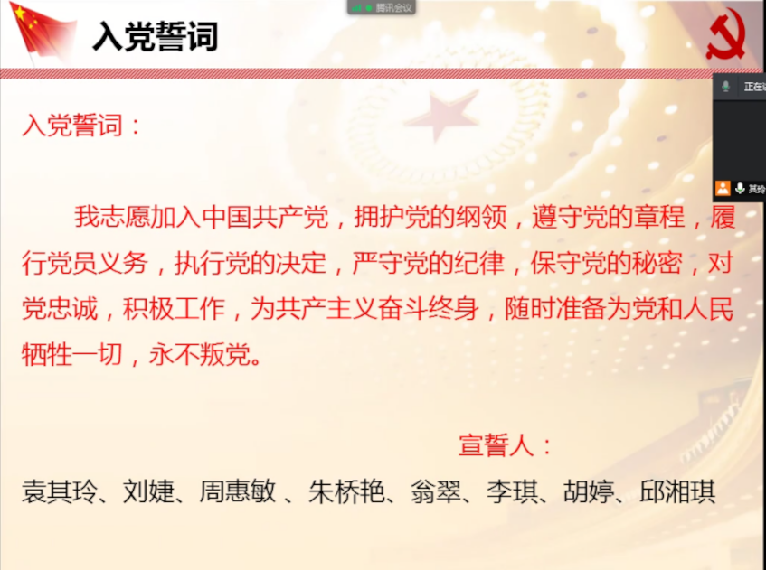 以重温入党誓词、集体朗诵党章为第一部分固定动作。“践行入党誓词,牢记使命担当”,与会全体教师党员举起右手,进行了庄严的宣誓,集体重温了入党誓词。活动使教师党员把践行入党誓词作为自己终身的必修课,做到“立为党之志、修为党之心、行为党之实”;“认真学习党章党规,做合格党员”,与会教师党员认真朗诵党章第六章,做到认真学习党章、严格遵守党章,将党章“内化于心,外化为行”。