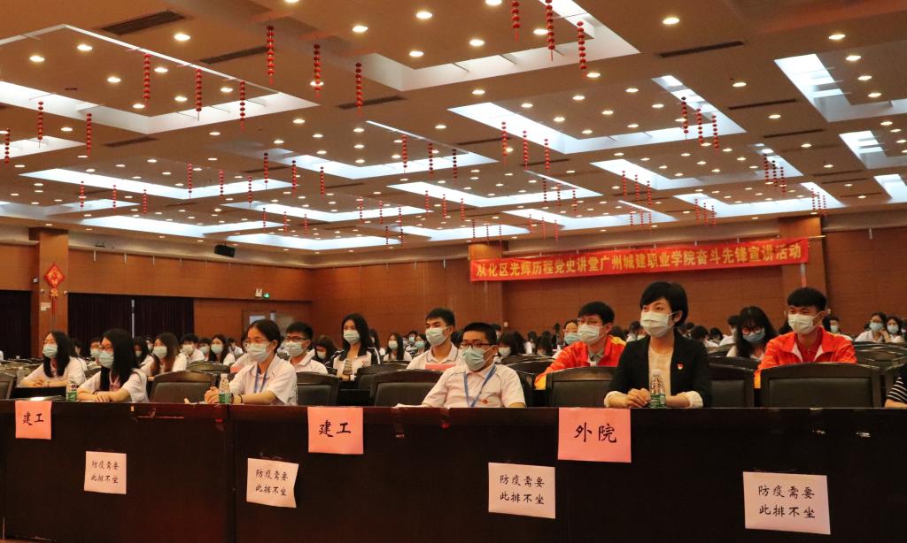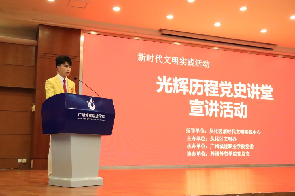 3月18日15点,由从化区文明办主办,广州城建职业学院党委承办,外语外贸学院党总支协办的“光辉历程党史讲堂之城建奋斗先锋”宣讲活动在人文艺术楼四楼报告厅顺利开讲。从化区委宣传部四级调研员黎志平、学校办公室副主任顾洪江、学校党委组织部部长吴辉军、学校党委组织部干事曾德钦、外语外贸学院副院长刘榕敏、外语外贸学院办公室主任罗青以及各学院学生党员代表出席了此次活动。