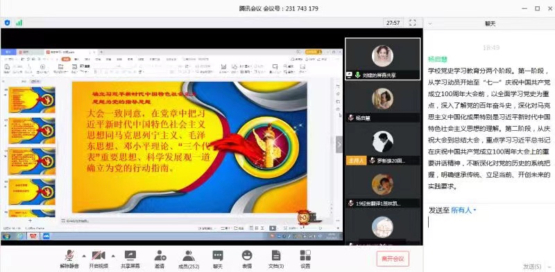 学院优秀教师党员刘婕老师为大家线上授课——《中国共产党简史》第七章《党的十九大和确立习近平新时代中国特色社会主义思想的指导思想、全面建成小康社会》。她带领党员们一起学习党史,了解中国共产党的成立过程,党的宗旨、性质和指导思想。党员们认真学习理论知识,积极连线回答党史知识,营造了良好的学习气氛。