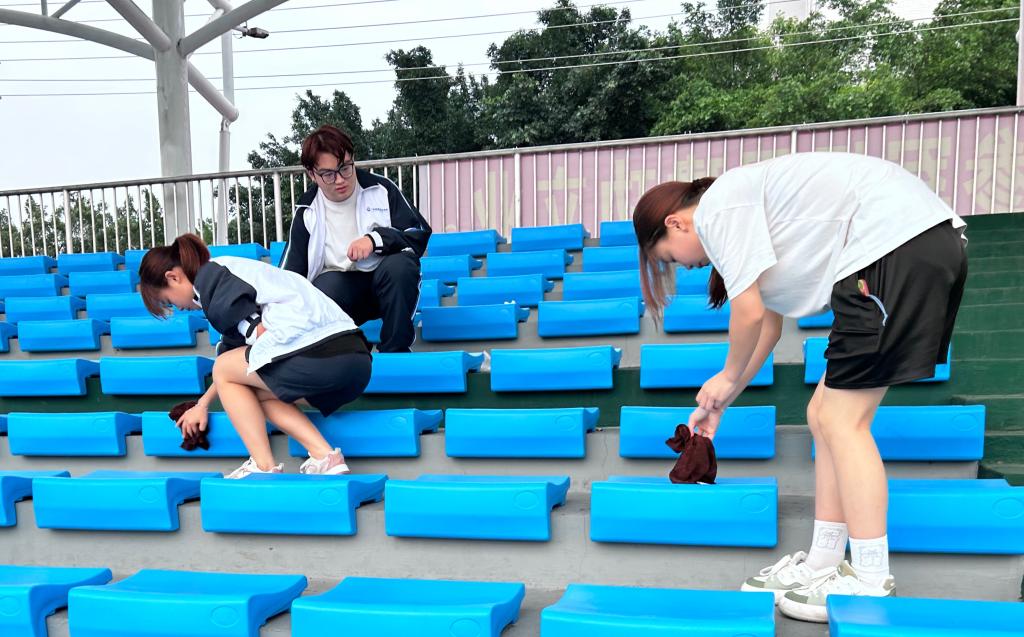 在学生第一党支部书记彭国美、学生党建办公室指导老师杨启慧的组织带领下,志愿者们分为6个小组,分别负责蓝、黄两个区域的板凳擦拭和观众席的清扫工作。志愿者们有的手持抹布,有的提着小水桶,积极投入到了劳动中。在劳动中,志愿者们的脸上明显可以看到了汗水,却丝毫没有看见志愿者们的懈怠和放松,每个人都尽职尽责完成了自己的任务。预备党员张鑫同志说:“我现在才真正体会到校园里的保洁阿姨是多么得不容易!感谢,每一个默默付出的中国人!每一个平凡而伟大“雷锋”!”