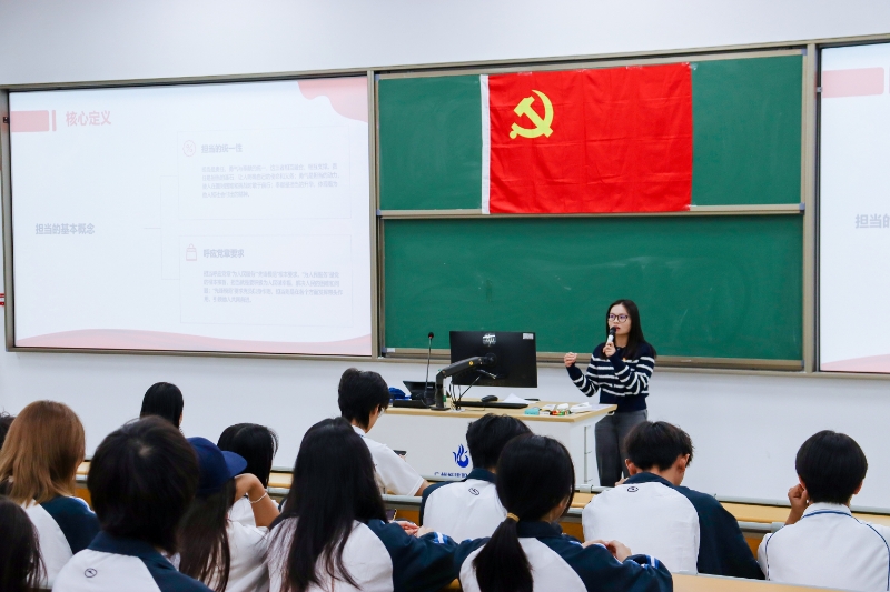 活动在庄严的国歌中拉开序幕,随后组织员王璐老师带来精彩分享。她以深厚的学识、鲜活的案例,深刻解读了“担当”的内涵,从“为中华之崛起而读书”的壮志,到“功成不必在我”的境界,再到“逢山开路、遇水搭桥”的行动,字字珠玑间满含对青年一代的殷切期许,为学子们指引了青春前行的方向,赢得现场阵阵掌声。